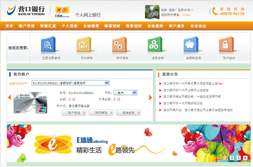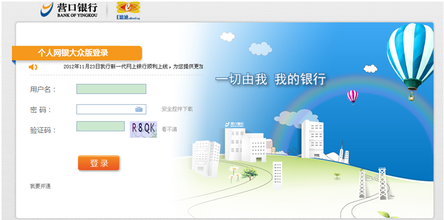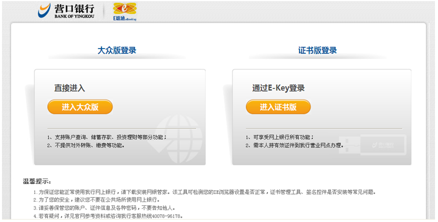登錄營口銀行官方網(wǎng)站(www.net0451.com),選擇個(gè)人網(wǎng)上銀行,點(diǎn)擊“進(jìn)入大眾版”![]() 點(diǎn)擊“進(jìn)入大眾版”后出現(xiàn)登錄頁面:![]() ![]() |