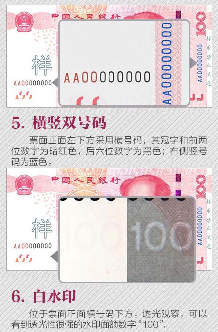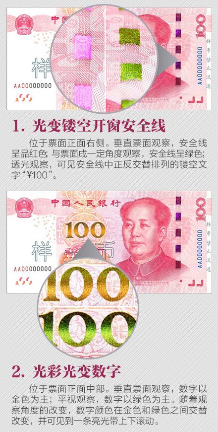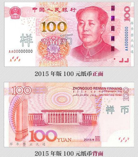 為更好地保護人民幣持有人的利益,需要根據科學技術的發(fā)展,不斷提高鈔票的防偽技術和印制質量,保持人民幣防偽技術的領先地位。為此,中國人民銀行發(fā)行了2015年版第五套人民幣100元紙幣,在保持規(guī)格、主圖案、主色調等與2005年版第五套人民幣100元紙幣不變的前提下,對票面圖案、防偽特征及其布局進行了調整,提高機讀性能,采用了先進的公眾防偽技術,更易于識別真?zhèn)巍?015年版第五套人民幣100元紙幣發(fā)行后,與同面額流通人民幣等值流通。