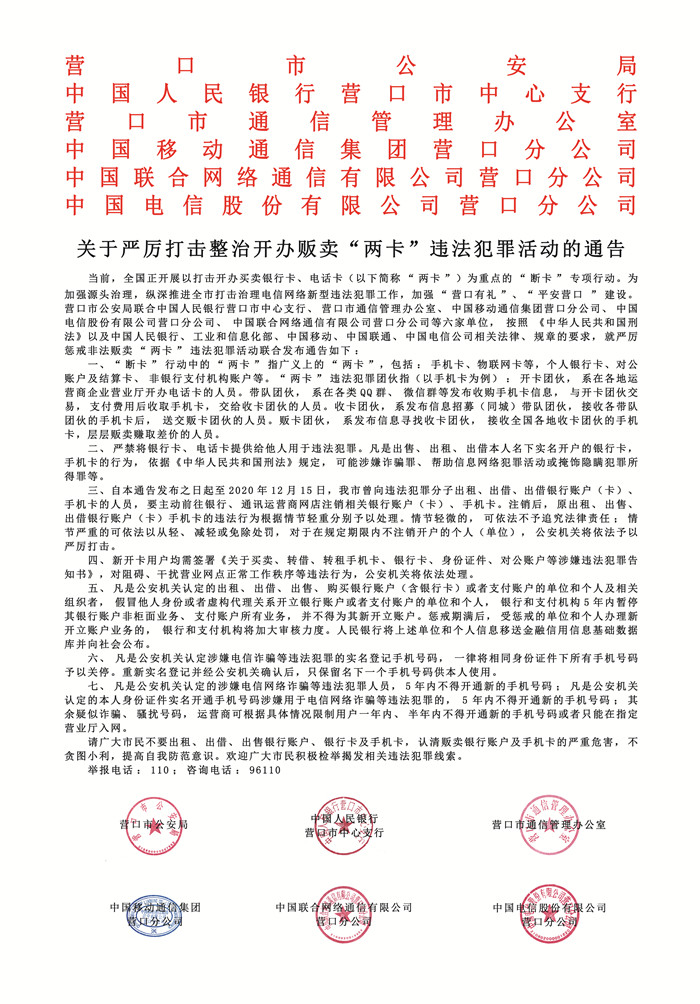 關(guān)于嚴(yán)厲打擊整治開辦販賣“兩卡”違法犯罪活動的通告